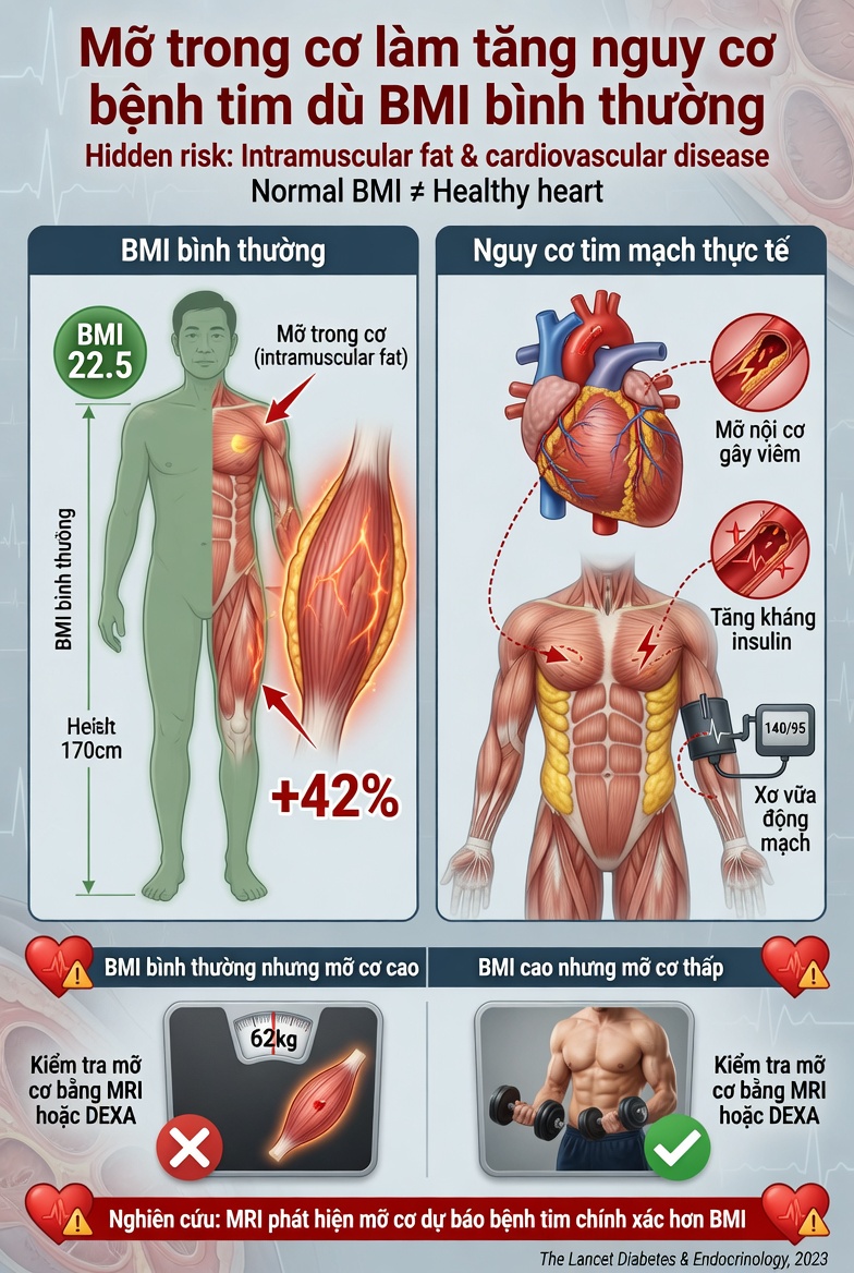 Mỡ trong cơ làm tăng nguy cơ bệnh tim dù BMI bình thường