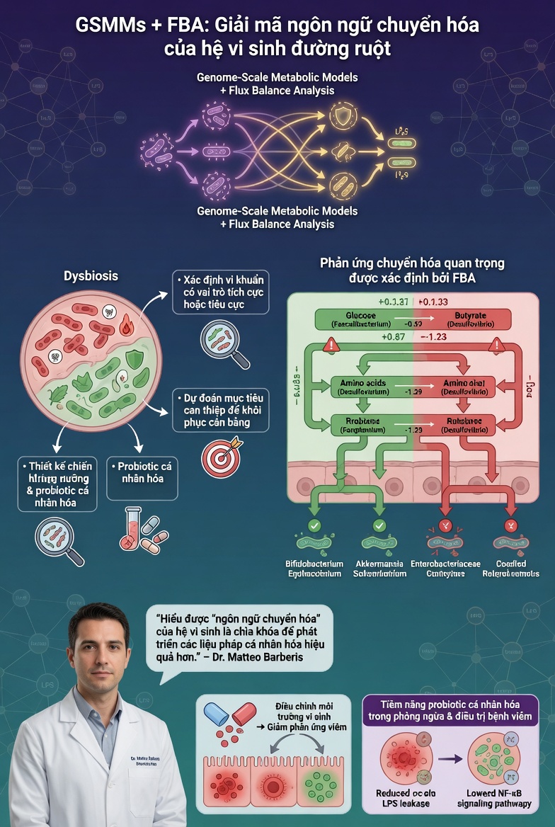 Trong khi đó, FBA là một phương pháp phân tích cho phép dự đoán dòng chuyển hóa (metabolic flux) trong các hệ sinh học. Bằng cách kết hợp GSMMs và FBA, nhóm nghiên cứu có thể mô phỏng hoạt động của hệ vi sinh đường ruột ở từng cá nhân.