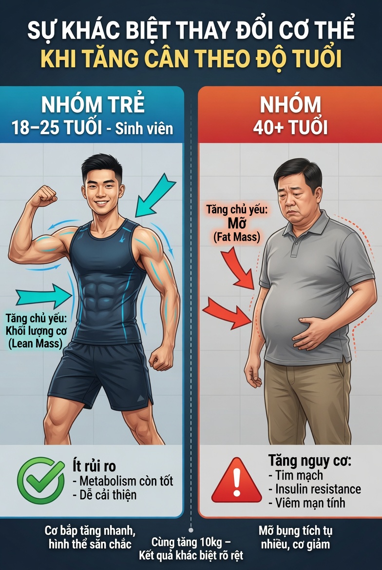 Nghiên cứu cho thấy tăng cân không chỉ là vấn đề về số kg mà còn phụ thuộc vào thành phần cơ thể, khi cùng một mức tăng cân nhưng có thể dẫn đến những tác động sức khỏe rất khác nhau giữa các nhóm tuổi, từ đó nhấn mạnh tầm quan trọng của việc hiểu rõ cơ chế thay đổi cơ thể theo từng giai đoạn để có chiến lược duy trì sức khỏe phù hợp.